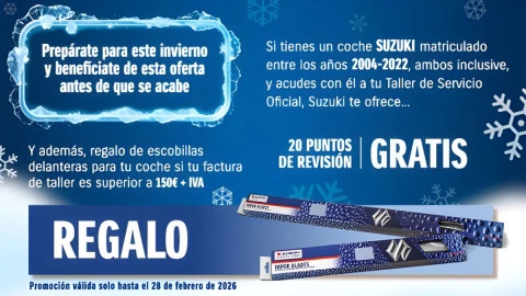 Si tienes un coche SUZUKI matriculado entre los años 2004-2022, ambos inclusive, y acudes con él a tu taller de servicio Oficial, Suzuki te ofrece...